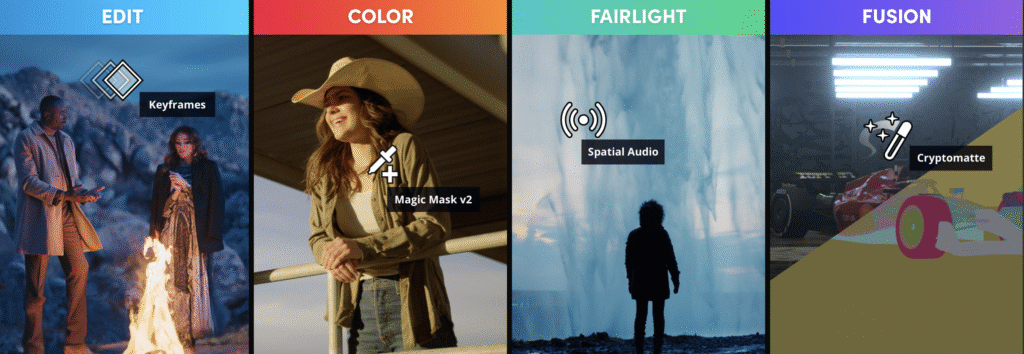 Resolve è una suite “tutto in uno”. Al suo interno non ha solo una, ma quattro applicazioni professionali: una pagina per il montaggio video tradizionale, una pagina (chiamata “Color”) che è lo strumento di color grading più potente al mondo, una pagina (“Fairlight”) che è una vera e propria workstation audio professionale, e una pagina (“Fusion”) per effetti speciali e motion graphics.